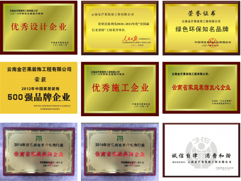 ● 2010年1月榮獲中國室內裝飾協會全國室內裝飾“優秀設計企業”、“優秀施工企業”;全國住宅裝飾裝修行業“AAA級誠信企業”、“昆明百姓信賴的十大品牌家裝公司”;