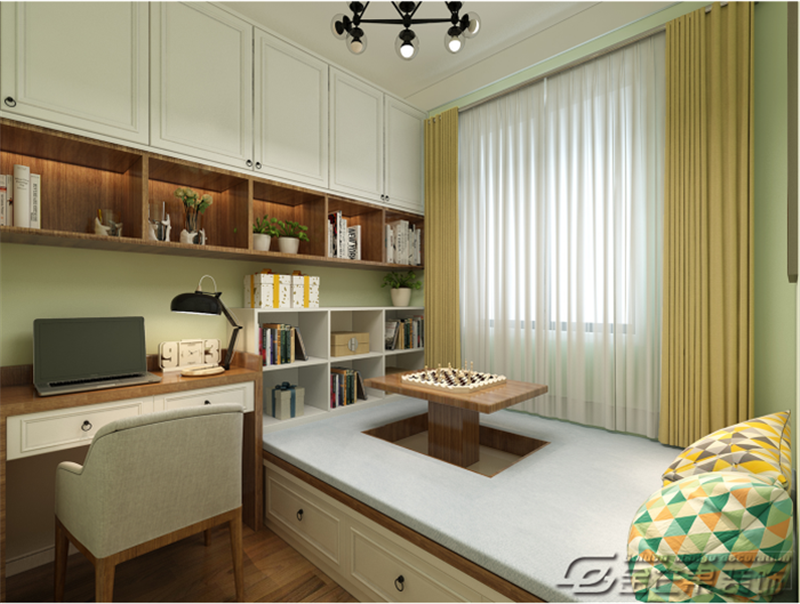 臥室是以溫暖的暖色系為主,非常溫馨,暖意融融,輕松舒適。有設(shè)計感的吊燈增加時尚感。白色窗簾溫柔又時尚,搭配黃、藍色,顏色明快、靈動、活潑。