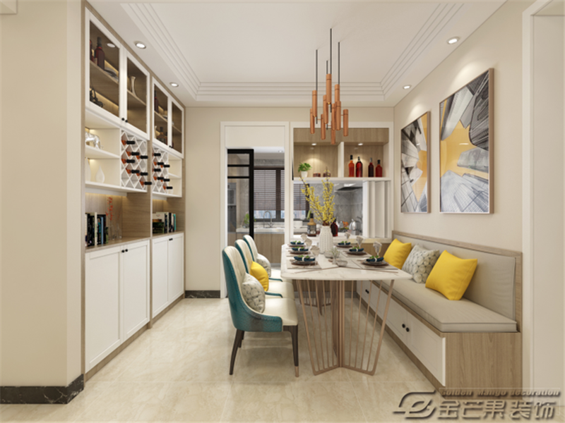 開放式的餐廳使空間更顯開闊,看上去并不死板,互動之間增加房間的煙火氣,使客人在做客時容易感受到主人的熱情和真摯。