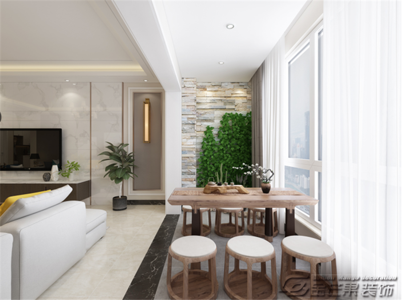 陽臺設(shè)置了木質(zhì)的小茶幾和椅子,搭配綠植,充滿大自然的味道。忙碌之后,到此喝一壺茶,看一下遠處的風景,不失為一樁美事。