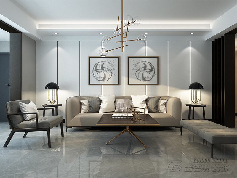 沙發背景墻白色板材拼接美觀時尚,兩幅裝飾畫增添了藝術的設計效果,兩側黑與金的撞色立燈凸顯對稱美,與不規則鎏金吊燈互相呼應。