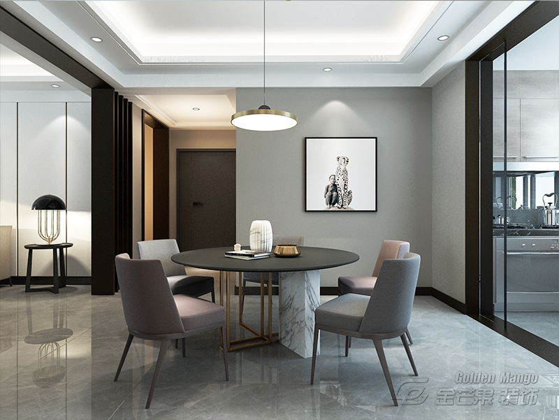 餐廳簡約吊燈設計,減少傳統吊燈對空間的壓抑和限制,餐桌椅與周邊一致的色系,讓區域更為統一。其中餐桌使用魚肚白石材與鎏金色幾何桌腿,蓋上黑色玻臺,碰撞出強烈的設計感。
