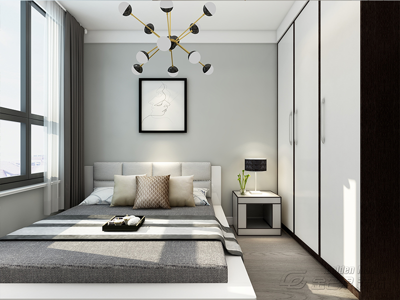 這個臥室同樣是以黑白灰為主體色調,床具、壁畫、窗簾、衣柜、幾何拼接設計的床頭柜,臺燈等都是純粹的黑白灰搭配;在其中摻入了一些亮眼的裝飾作為點睛之筆,比如:亞麻色和鎏金色抱枕、黑白金撞色設計的吊燈‘’床頭柜上的綠植,都讓整體空間沉靜中略帶一絲活潑。
