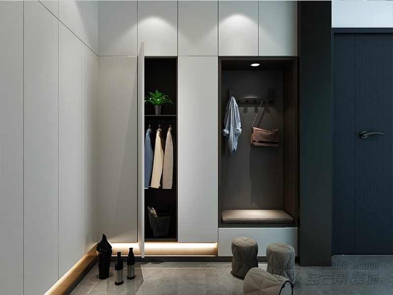 轉角L形的大鞋帽間,柜體摩登灰與暖白色門板搭配相得益彰,且讓家居儲放更加隨心所欲,局部開放設計作為掛飾區的同時還能緩解視覺壓抑。柜子下面留空部分可做換鞋儲放,且加入嵌入式暗燈帶,增加光源的同時設計感滿滿。