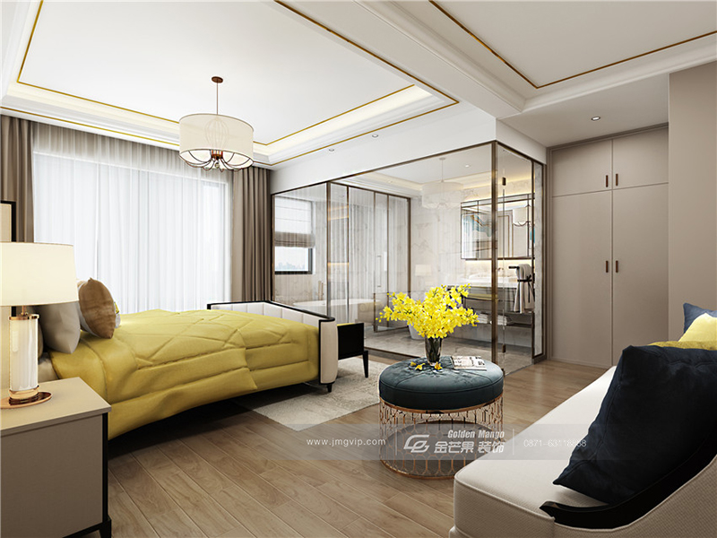大氣、優(yōu)雅的象牙白搭配個性得燈飾,用黃色的家居點(diǎn)綴明亮的空間。玻璃柜體時尚、精致有個性,增加房間通透感。