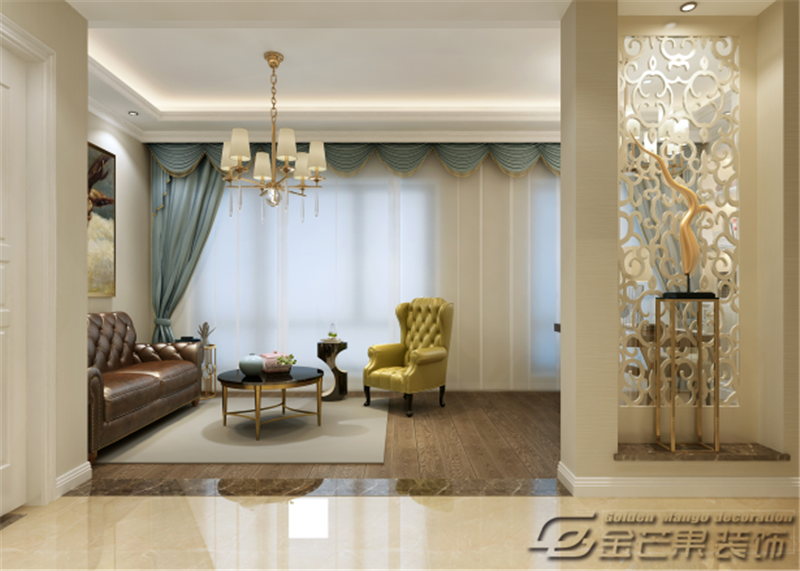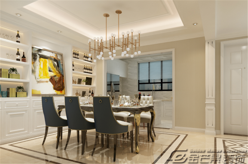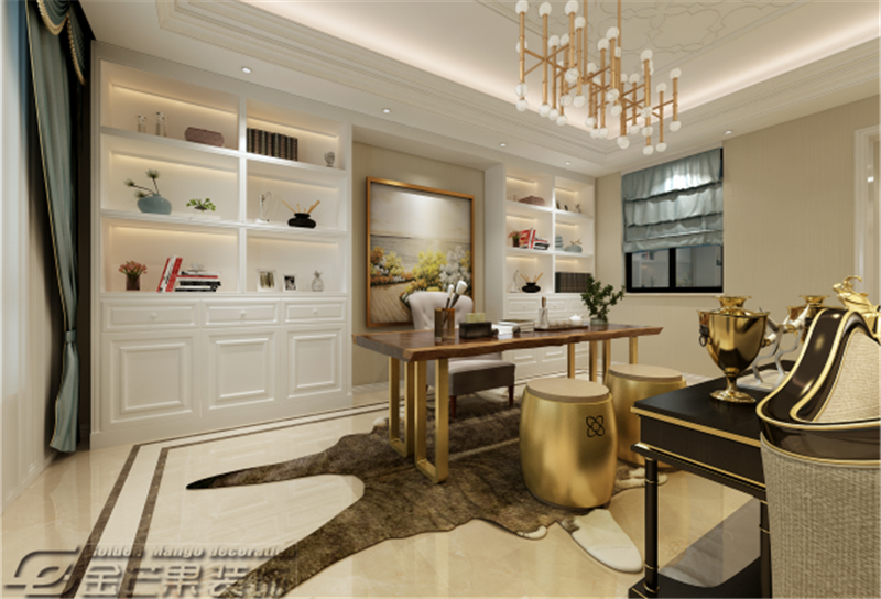 整體空間是以白色為主色調,搭配棕色、米色、金色等輔助顏色,通過色彩的對比給人打造出一種華麗的感覺。充滿歐式特色的窗簾、沙發、桌椅、裝飾畫打造歐式風格。金色家具的應用給人奢華之感但又不顯夸張,恰到好處。客廳和書房的搭配增加房間的功能性。