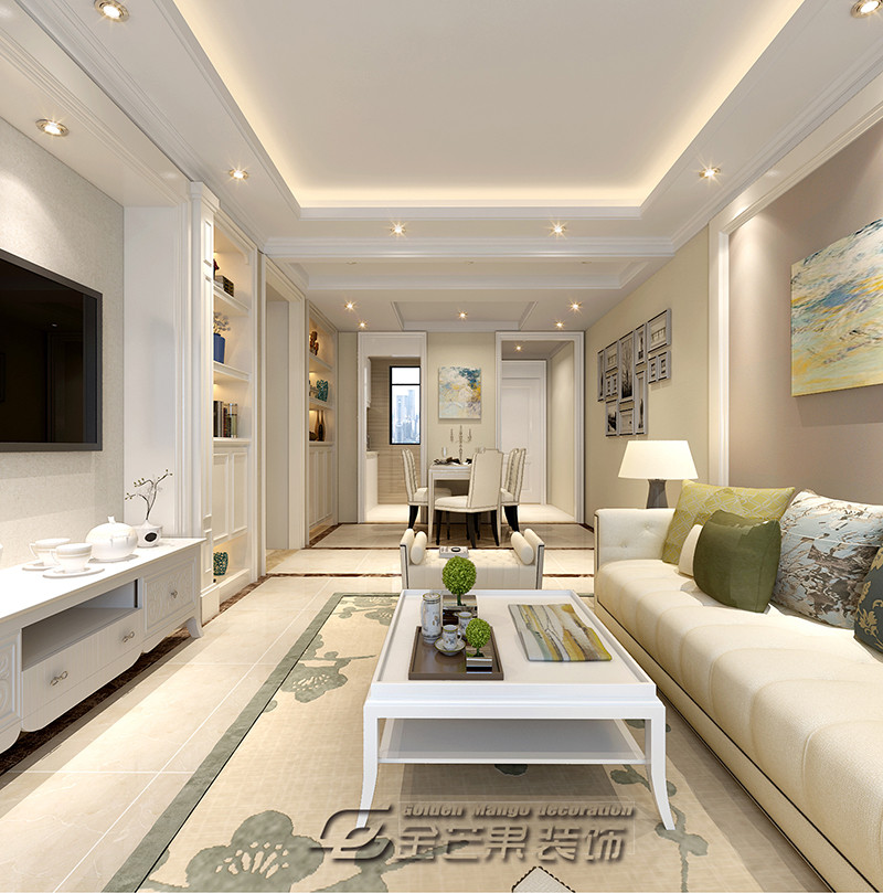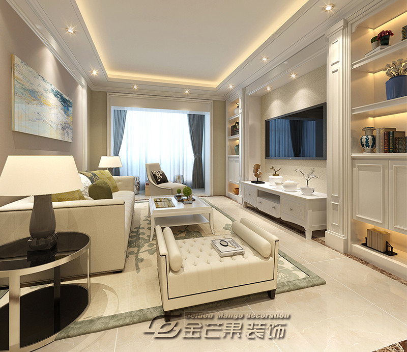整體空間以白色為主色調,歐式的家具打造歐式風情,搭配清新、優雅的綠色,精致、有韻味。綠色的抱枕點亮整個空間,讓空間顏色、層次更豐富了。