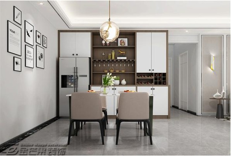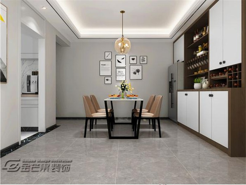 餐廳亦是延襲了簡約大方的格調,淺色調的運用讓家居顯得更加寬敞。餐邊柜的選用讓用餐空間溫馨簡潔,和餐桌椅一簡一繁形成對比,大容量功能收起生活瑣碎。藝術裝飾畫增加空間格調。