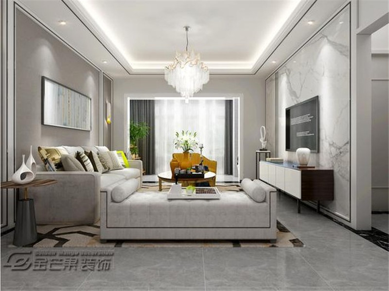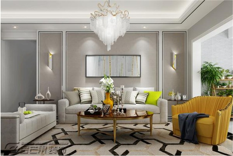 整體灰色的色調經典時尚不易過時,輔以經典的灰色細線條增加空間感。明黃色的沙發椅為空間增添明媚的顏色,而且黃色往往能營造溫馨的家居氛圍。