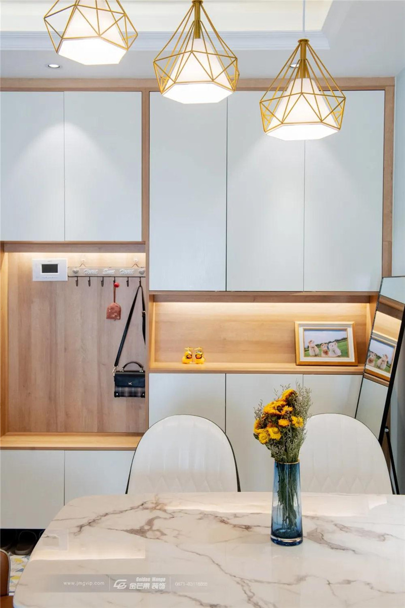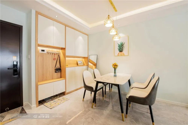 入門玄關柜連著卡座,換鞋、放置包包、鑰匙等小物件,進出門更加便利。收拾好生活的瑣碎,才能騰出手牽著親愛的你。