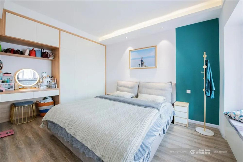純凈白色墻壁融入干凈綠色的元素,讓整體空間不會顯得單調,緩解視覺疲勞。電視背景墻旁邊潛藏的臥室暗門,別有洞天。