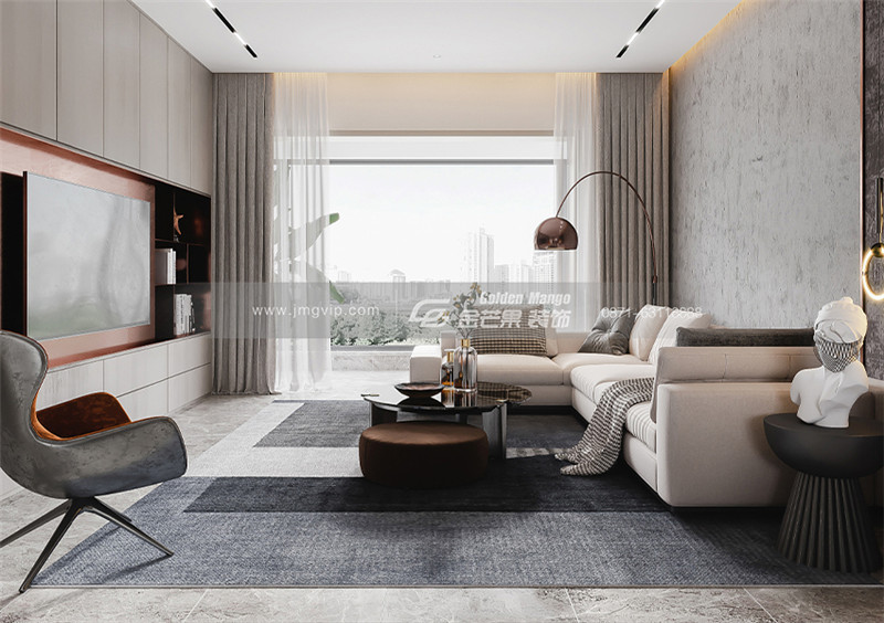 黑白灰的高級色調搭配棕色的家具點綴,讓整個空間透露出一種清冽、不落于凡塵的高級之感。鐵藝的家具搭配有質感的地毯,高貴而不張揚。溫柔的白色紗簾讓整個空間通透、干凈,打造高級感。