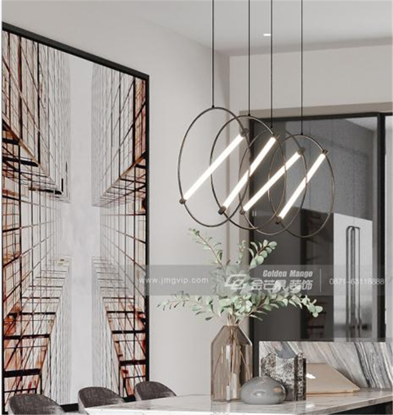 灰色的簡約和純粹的綠色搭配,營造出一種清新、清冽的氛圍。個性的燈飾為整個空間增色不少,讓餐廳變得更加精致了,也更有藝術感了。
