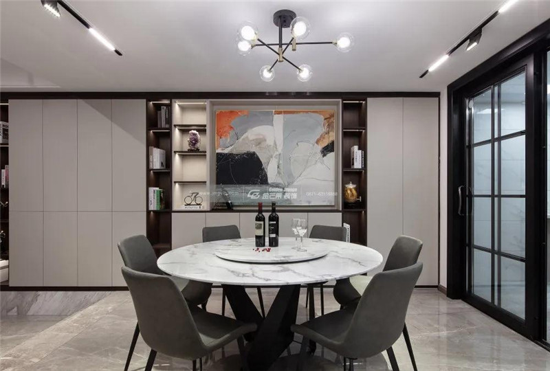大理石臺面的餐桌和柜體形成顏色上的呼應,深色的餐座椅在淺色系的空間里形成明度上的呼應。頂面可移動的軌道燈可以將光源隨時變換,體驗感更佳。