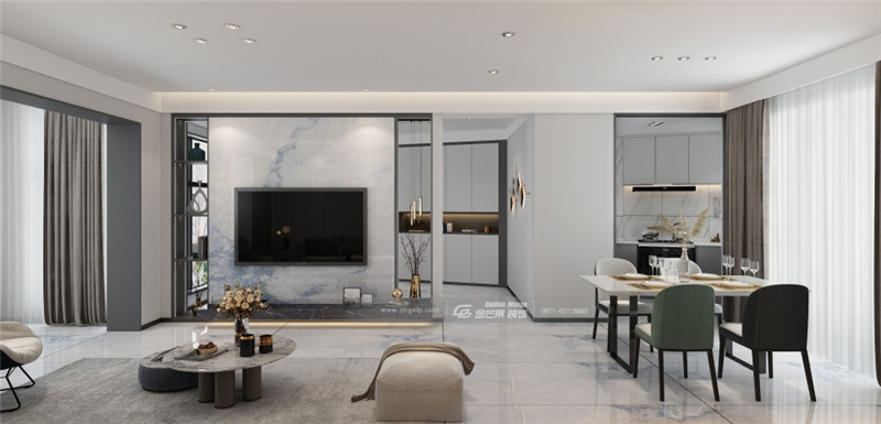 電視背景墻采用石材的材質,簡雅的紋路顯而不露,藝術感的展現。兩邊的鏤空豐富空間層次,讓空間不會顯得單調。簡約的小幾讓空間更有韻味,優雅氣質。