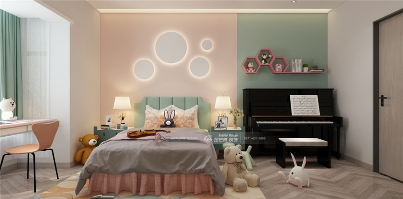 清新、靚麗的配色,給孩子一個絢麗的童年,可愛的燈飾不規則的造型讓空間充滿活潑、童趣。整體空間是純凈、甜美的風格。