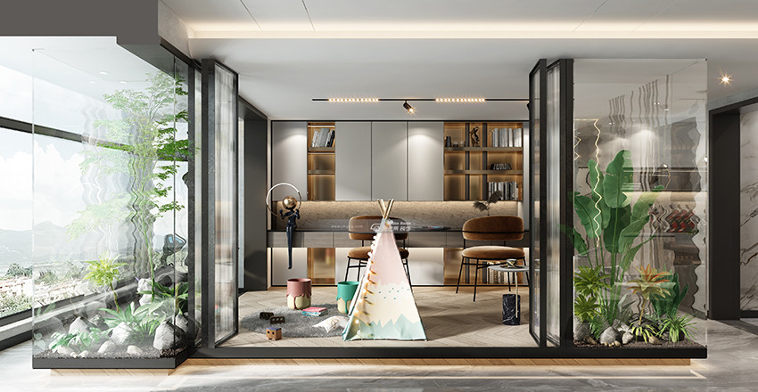 隔斷隔而不斷,加入一些簡單的綠植,營造一種大自然的通透感,與室外風景結合,一幅美好的圖景。