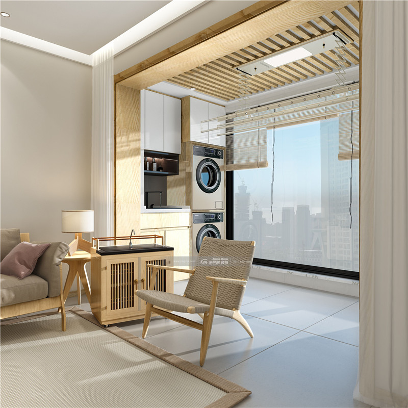 客廳陽臺洗衣機也是內嵌的,很節省空間。充滿木香氣和陽光的味道混合在一起的香氣,陽臺空間也很愜意哦。