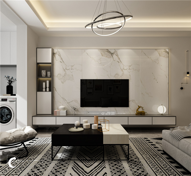 大理石上墻,簡(jiǎn)約時(shí)尚的紋理讓整個(gè)空間大氣不失格調(diào),黑白簡(jiǎn)約的茶幾精致、有個(gè)性。