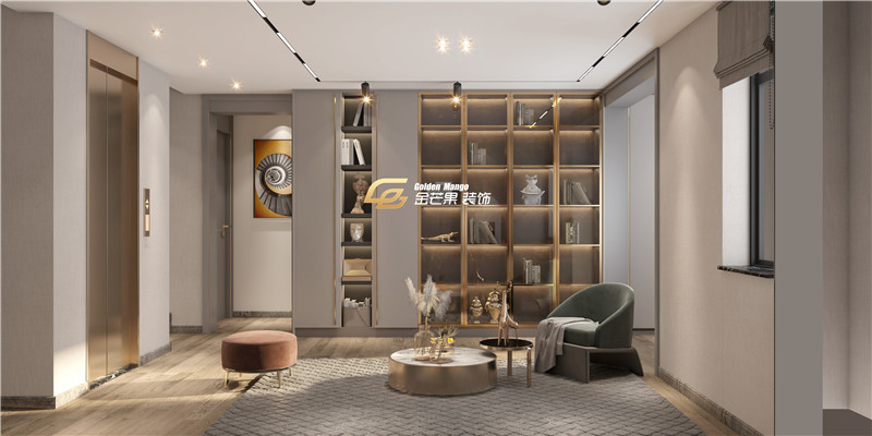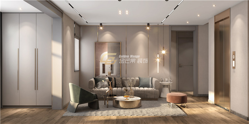 小型會客休閑區,燈影和金屬線條相互輝映投下精致的光線,溫柔的顏色和木地板帶來精致又慵懶的舒適感,點綴一些顏色細膩溫柔的單椅,氣質華麗又精美。