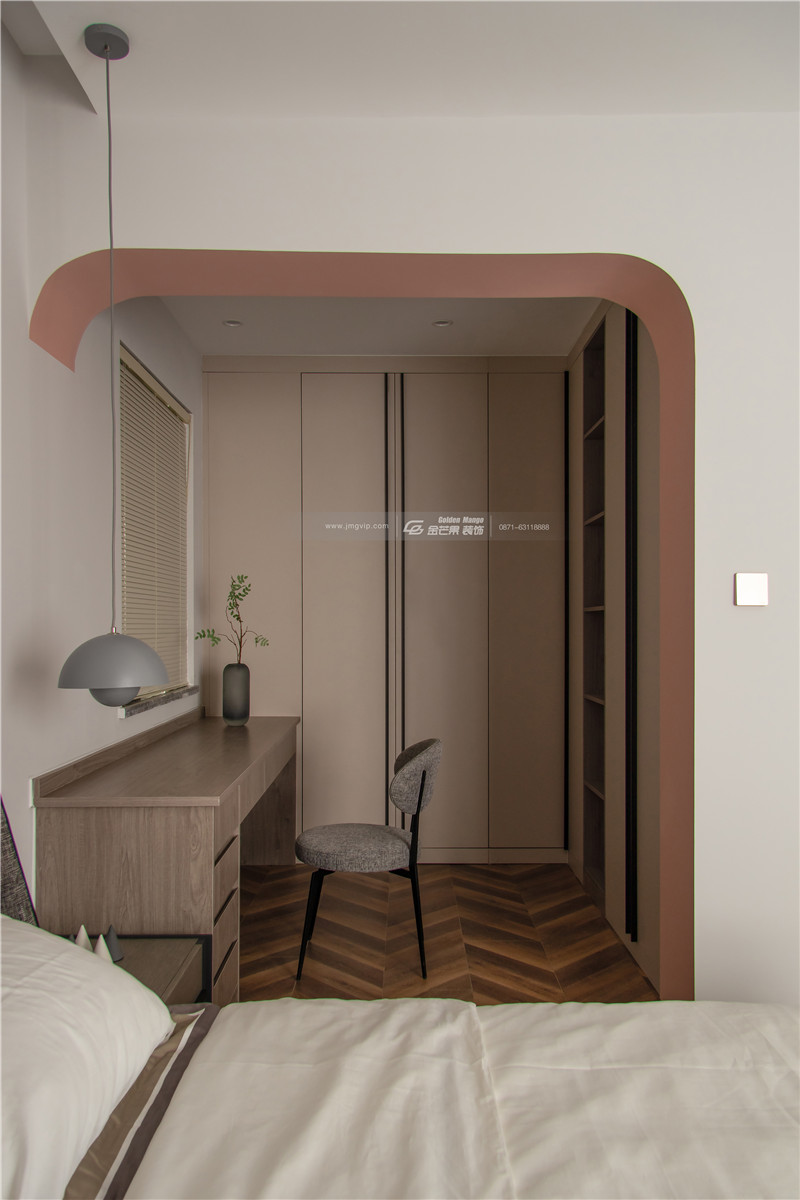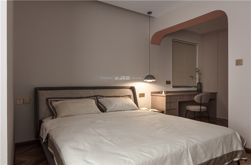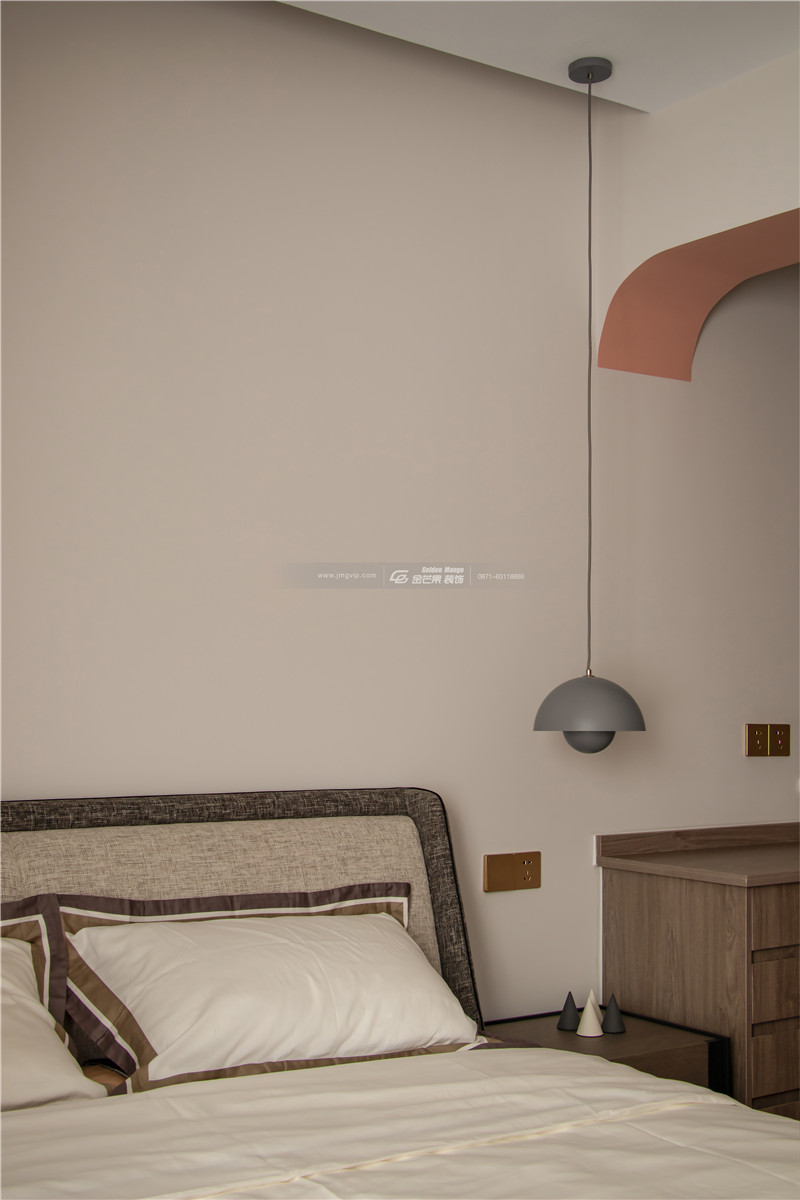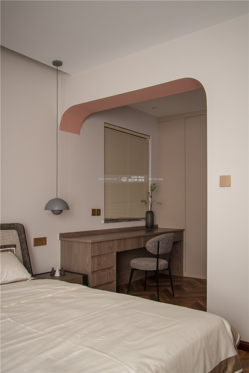 運(yùn)用拱形的弧度讓空間更顯溫柔,上淺下深的顏色空間感很強(qiáng),且對(duì)比的顏色對(duì)比之中展現(xiàn)獨(dú)特的家居魅力。地板上的花紋和顏色和整體基調(diào)搭配得當(dāng),增加活潑、明媚的顏色。溫柔、嫵媚氣質(zhì)太驚艷了。