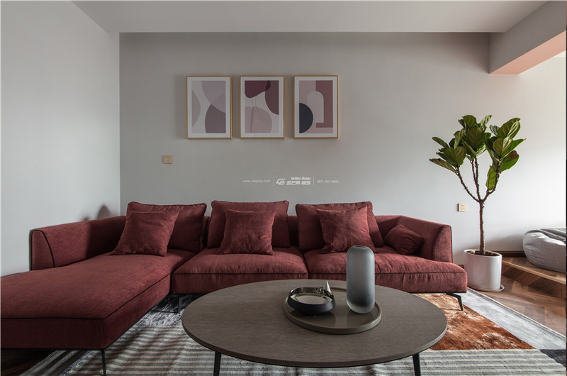 全屋大量運(yùn)用淺紅色,既有成熟的韻味,也不乏少女的羞澀感。紅色沙發(fā)和地板顏色相近,和上面的白墻形成對(duì)比,一分為二又和諧共生。線(xiàn)條多運(yùn)用溫柔的曲線(xiàn),打造細(xì)膩溫柔的感覺(jué)。