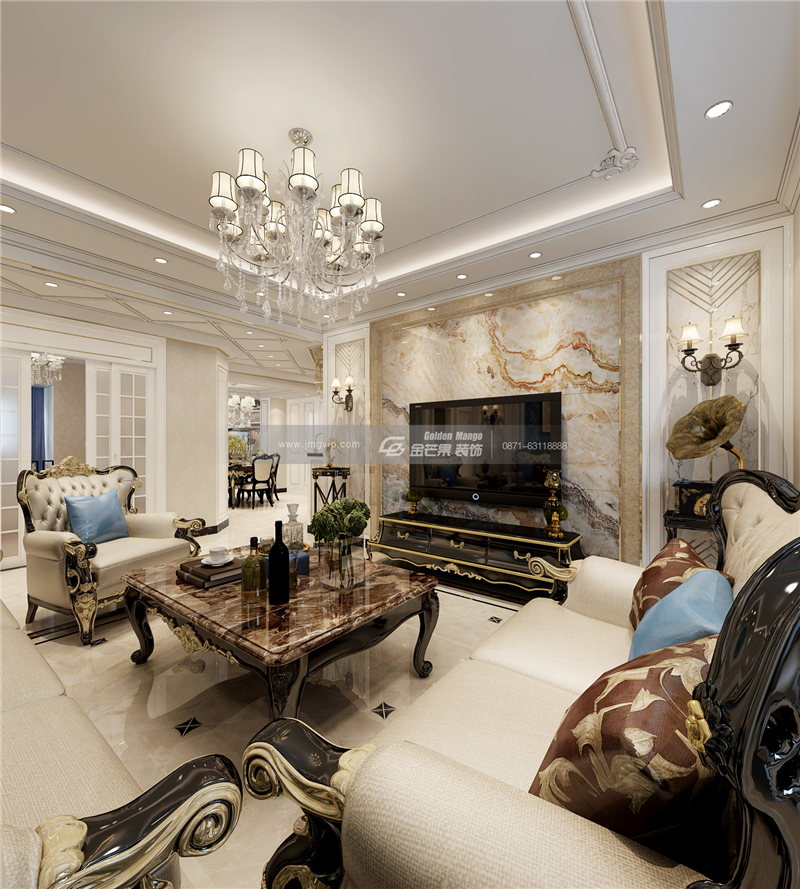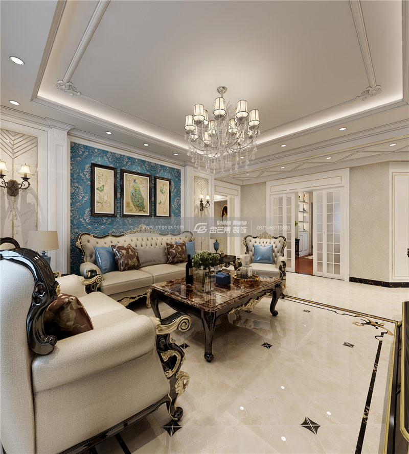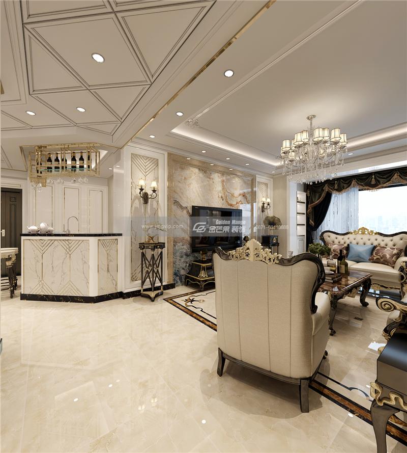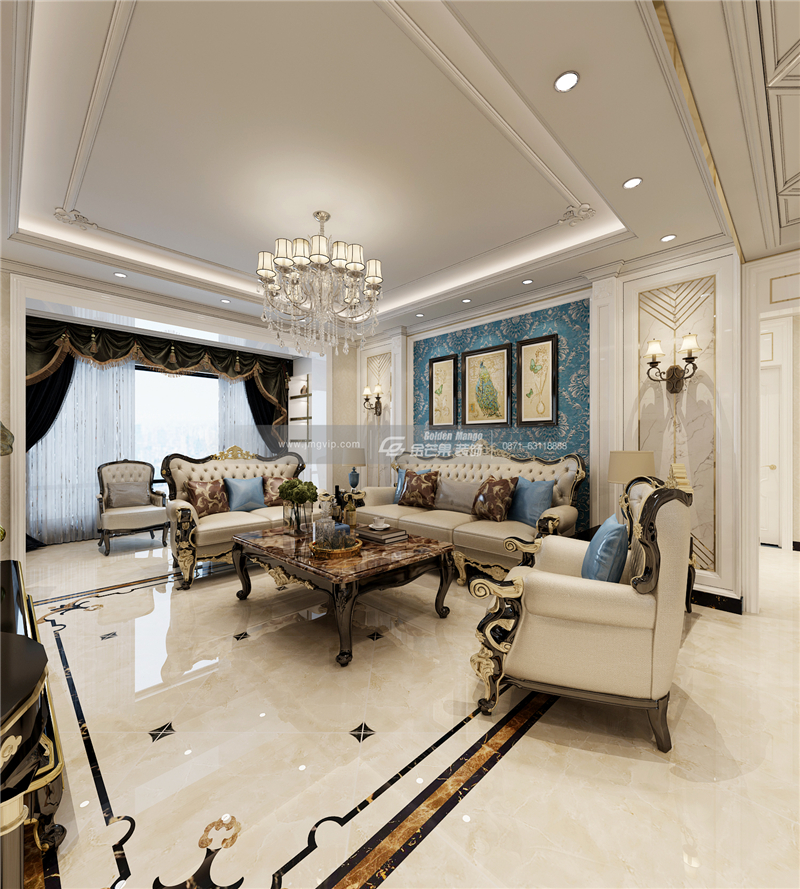 在極簡的風格中,加入線條、金屬、石材等極具張力的元素,以高品質、設計感、舒適、簡約為風格特點,與其說追求一種輕奢的風格,不如說追求一種自我的生活態度。地磚、沙發背景墻、墻上的雕花花紋,營造華麗而不張揚的生活理念,歐式的沙發和茶幾,舒適優雅,低調的奢華。