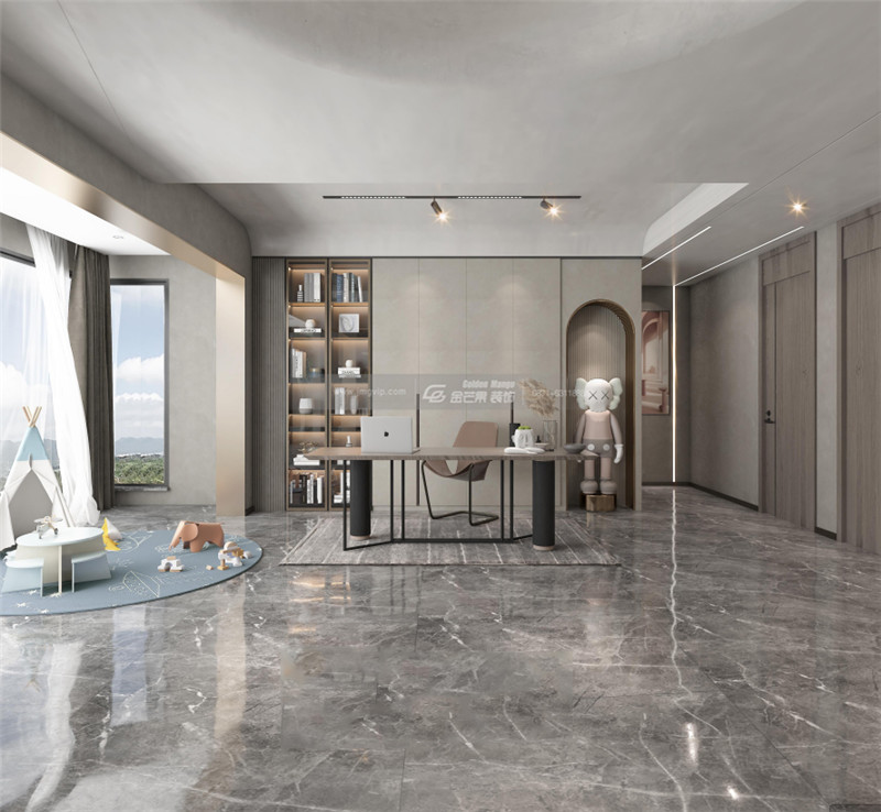 大面積的落地窗,通透、自在的辦公空間,兩邊風格不同的造型,一邊是嚴謹安靜、一邊是可愛溫馨,家居氛圍在多變中碰撞出個性。