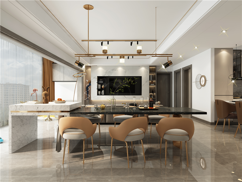 金色餐桌椅搭配黑白石材桌子,用細(xì)節(jié)點(diǎn)綴出精致的家居氛圍,石材和金屬線條、材質(zhì)碰撞出的高級(jí)感,更添儀式感和精致的感覺(jué)。