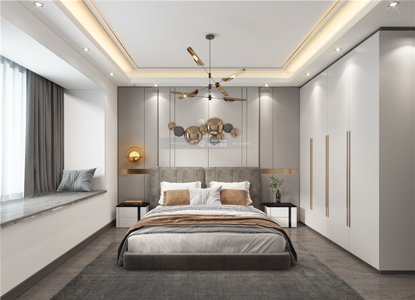 細(xì)膩溫暖的配色,為臥室注入舒適、安心的氣息。沒(méi)有太多華麗的顏色,卻品質(zhì)感自現(xiàn),用一些金屬線條點(diǎn)綴,營(yíng)造精致、有格調(diào)的家居氛圍。