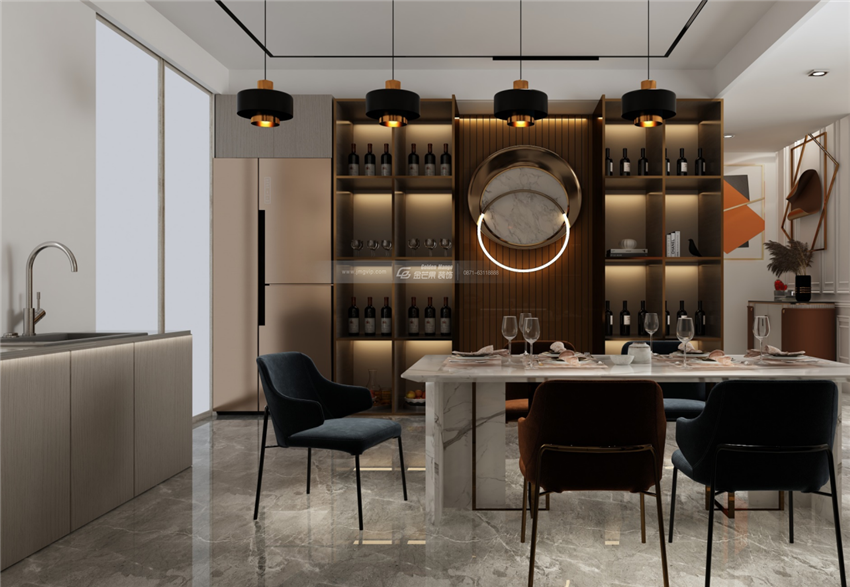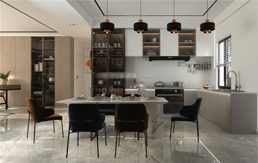 悠然的光線,打造光影和材質之間的藝術感,大理石餐桌搭配有質感的絨布單椅,高級感彰顯。