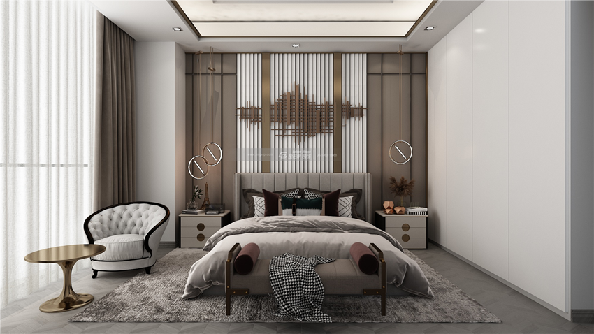 豐富的空間層次,細膩的灰白色加入些溫柔的氣息,讓臥室變得更加溫柔細膩。加以金屬元素的點綴,精致、時尚的品質感,時尚格調的家具氛圍。