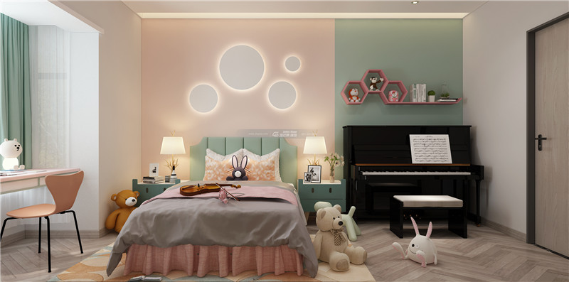 粉嫩的顏色是兒童房的寵兒,粉色、綠色拼色處理,描繪絢麗的童年,活潑的造型,有趣的卡通裝飾,都在互相講述一個童話里的故事。