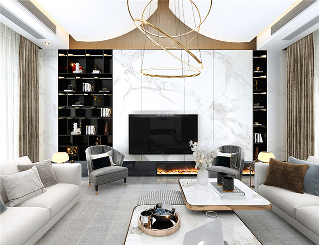 黑白灰的高級搭配,大理石電視背景墻和黑色輕奢的柜體,打造層次感。壁爐的加入,更增添了一些溫暖優雅的氣息?;疑嘲l和地毯,經典耐看,高級感呈現。