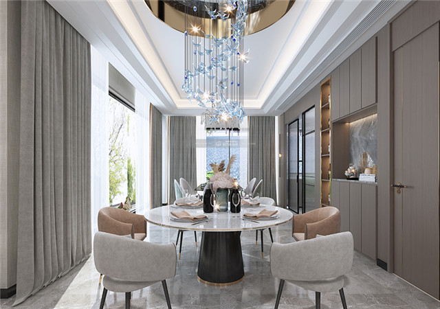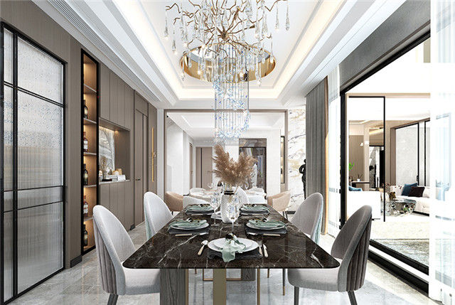 垂墜的燈飾傳達華麗的家居態度,讓整個家居氛圍呈現雍容華貴的氣息,大理石加金屬線條的餐桌臺面,精致的餐具,在光影交錯間,一切都變得充滿儀式感。