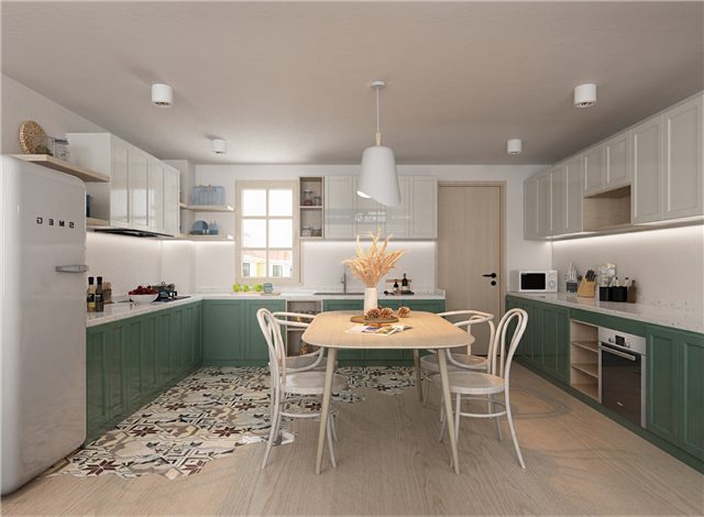 綠色和白色的搭配,可可愛愛,溫溫柔柔,可愛的地毯、餐桌椅、家居飾品,讓廚房彌漫清新、自由、慵懶、放松的氛圍。在這樣可可愛愛的廚房做出來的美食,一定也充滿了香甜的味道。