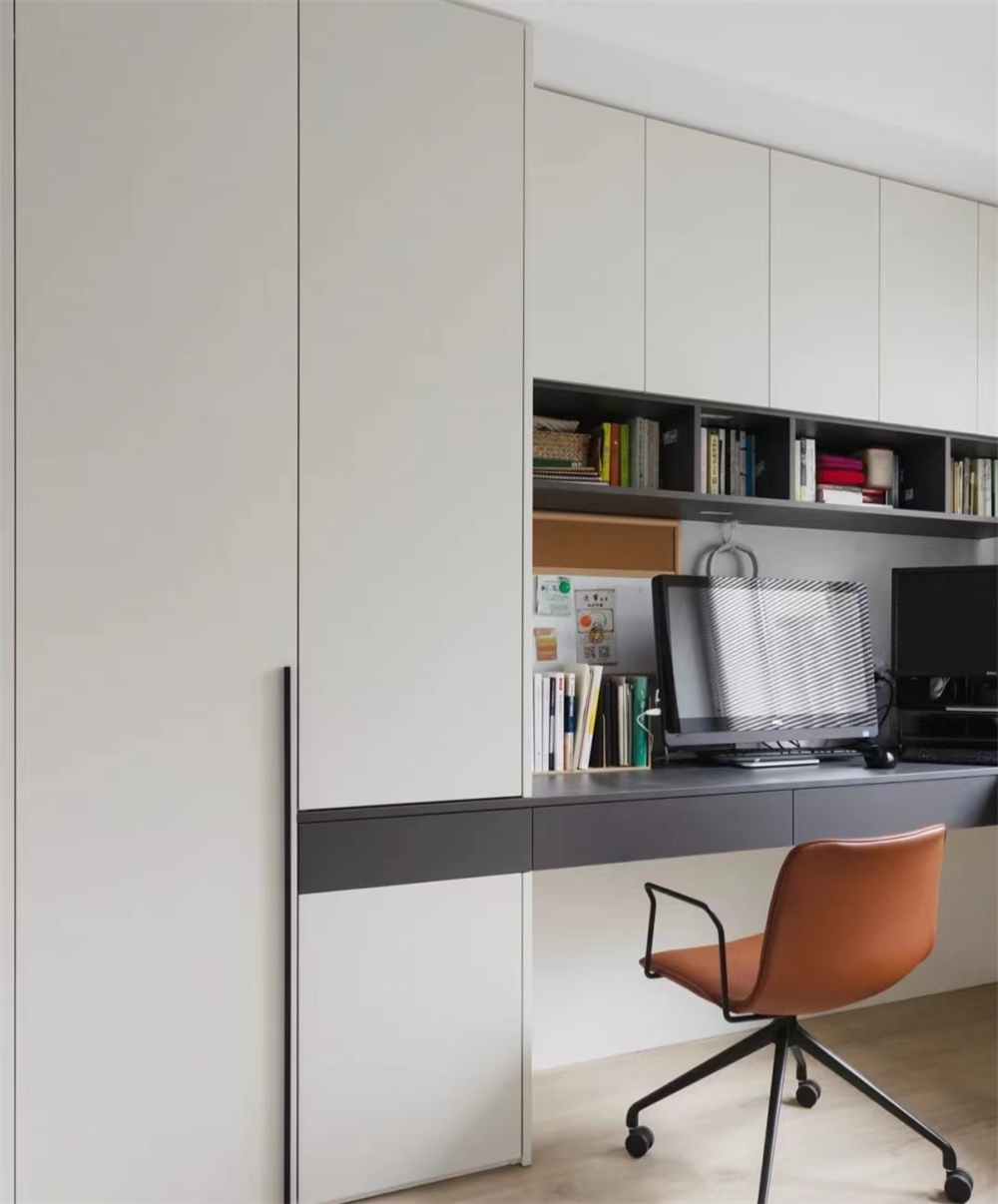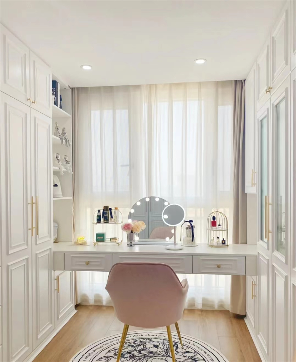 沒有多余的空間設計衣帽間,但又不想遺憾錯失,該怎么辦呢?幸福金芒果裝飾教您一個小妙招,那就是大膽嘗試不同的功能區(qū)結合,比如:書房空間、化妝空間等,可以將書房區(qū)或者化妝區(qū)置入衣帽間之內(nèi),根據(jù)使用側重點去設計安排功能占比,實現(xiàn)空間功能合二為一!