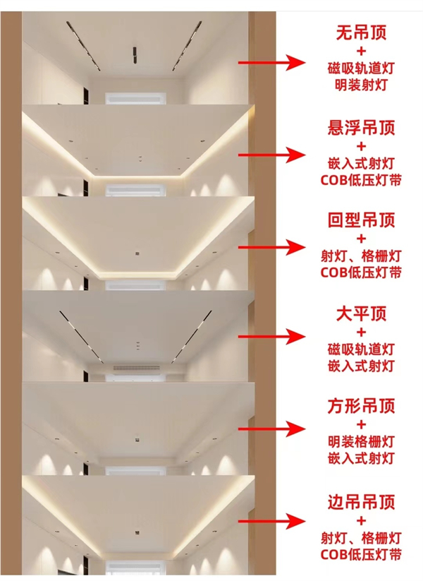 ③層高≥3m的,吊頂方式可以有更多樣的選擇,二級吊頂的造型也可以有更多元的發揮,即雙層以上的,垂直高度一般≥200mm。吊頂與照明、墻面裝飾也能結合起來,形成一體的裝飾風格。