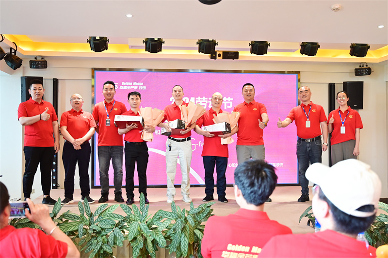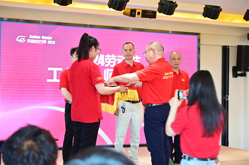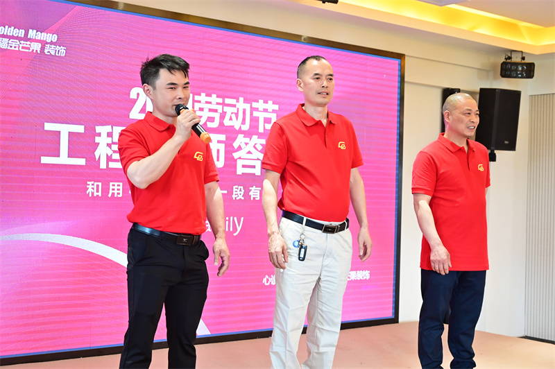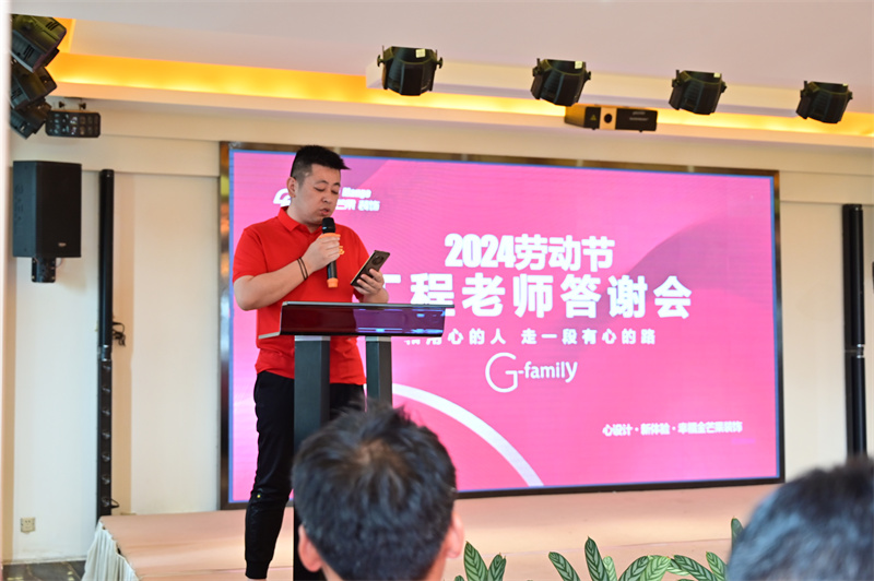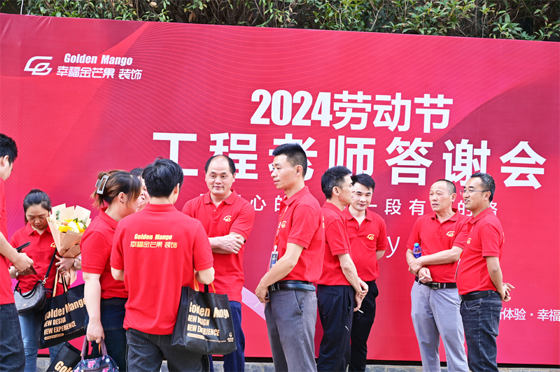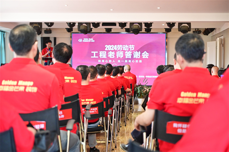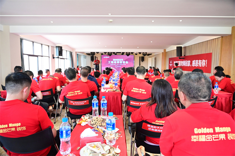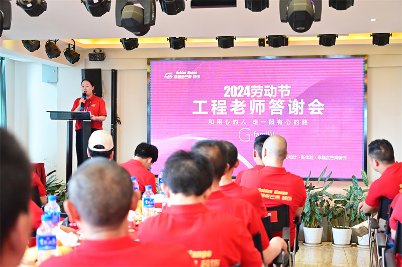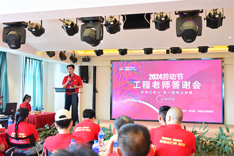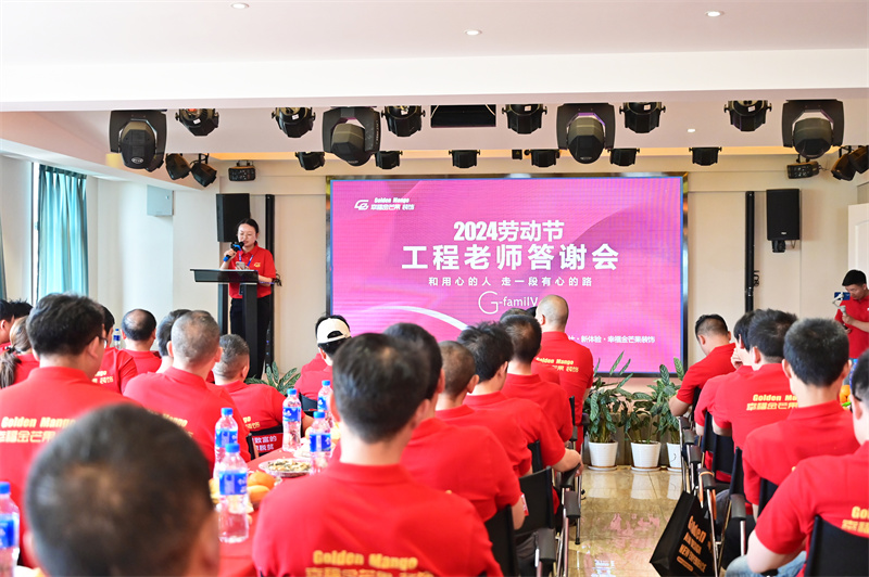 答謝會現場,總經辦領導上臺致辭,感謝工程老師們的精工細作,為金芒果打造了一個又一個高品質、好口碑的匠心工地,金芒果也會聚焦一線工地,關注工程老師們的切身需求和工地品質,讓大家的匠心精神得以充分的展現。