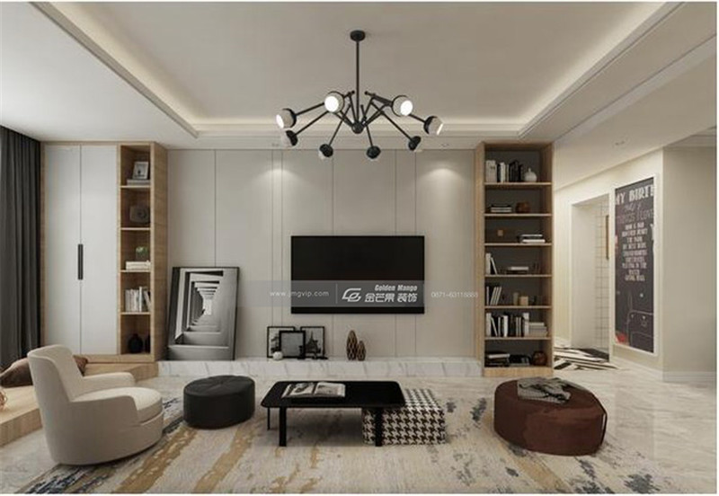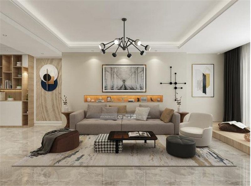 沙發背景墻裝飾靜中顯動,讓家居氛圍在舒適的基礎上更增活潑,和客廳燈飾呼應。