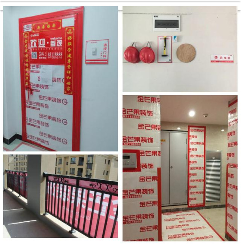 施工過程中對項目外圍、電梯口、入戶等施工現場,包括門把手、地磚、推拉門軌道等成品及半成品做好保護工,材料堆放整齊,提供文明、整潔、安全的施工環境。