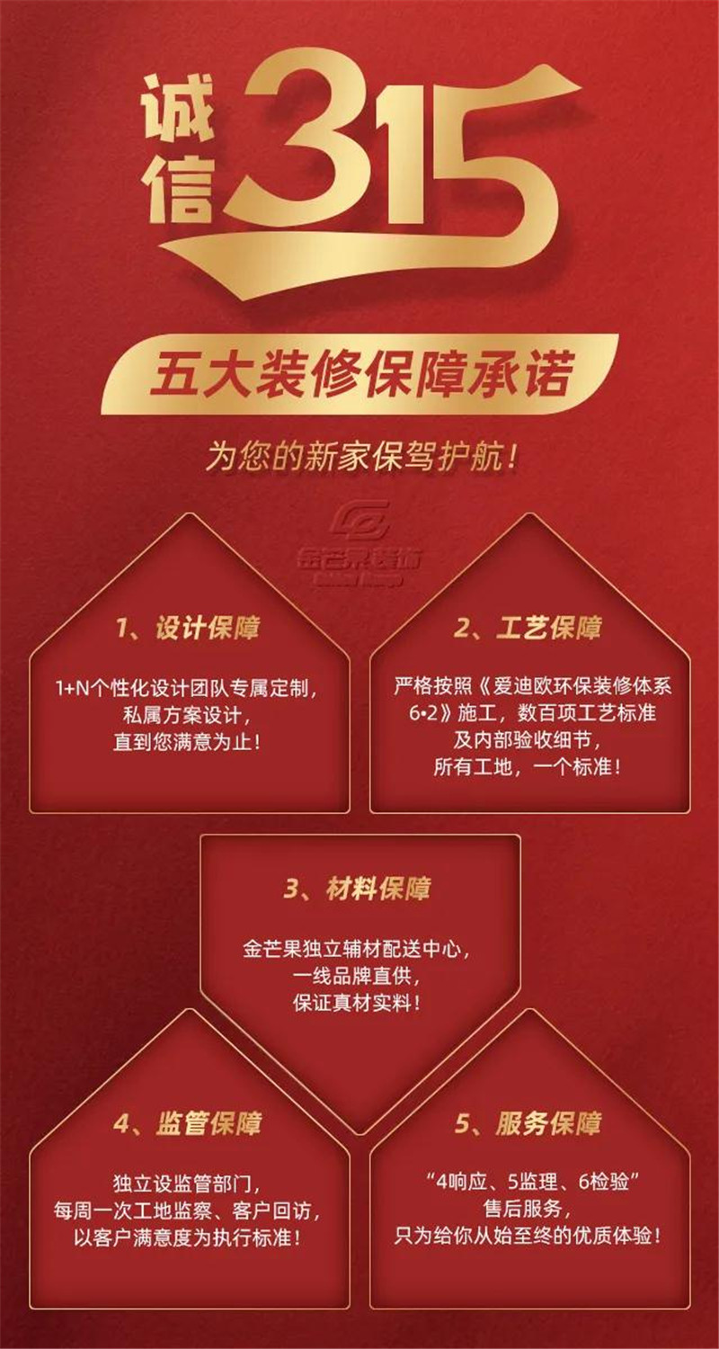 誠(chéng)信315,各大家裝公司都有備而來,金芒果一直踐行的是價(jià)格、工藝、環(huán)保、服務(wù)全透明的家裝模式。我們能做的就是在給“利”的活動(dòng)基礎(chǔ)上,保證消費(fèi)質(zhì)量和消費(fèi)者權(quán)益。